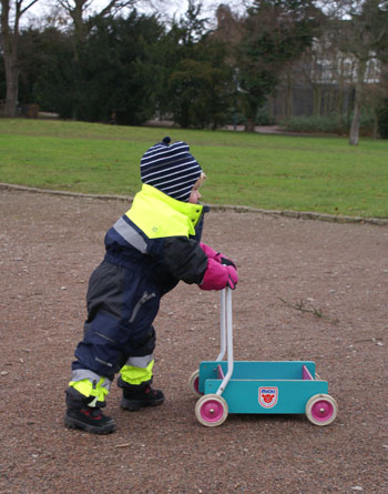 Hela helgen har Anton tränat med sin gåvagn, både inomhus och ute i stormen. | I lördags var Anna & Anton i stadsparken och lekte. Anton tog sig mellan de olika aktiviteterna själv med hjälp av sin gåvagn. Nu har han fått kläm på svängandet också. Idag söndag har Anton och jag varit på lekplatsen i stadsparken. Det blev inte så mycket gående med gåvagnen. Anton visade istället mig att han kan åka nerför stora rutschkanan. Först gick vi upp för trappstegen, sedan fick jag springa ner, när jag stod där ner - så kastade Anton sig utför med ett glädjeskrik. Sedan började vi om igen ... |
