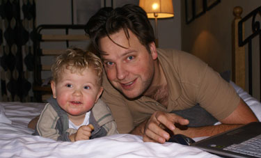 Nu är vi halvvägs igenom vårt Göteborgsäventyr. Anton är mycket skeptisk till alla nya människor med vita rockar men han har klarat denna dagen bra. | Hela familjen har haft ett fullt schema med aktivitet från tio till fyra. Vi började med stick i fingret på labbet, sen var det fotografering. Anton var sur och sa/skrek "färdig" hela tiden så speciellt charmig blev han inte på bilderna!! Efter det var det diverse information på avdelningen och pannkakor med sylt. Klockan tolv fick Anton en massa sladdar på huvudet. Han somnade enligt plan och ett EEG under sömn kunde genomfördas. Då Anton varit jätte duktig fick han välja en present, självklart blev det en bil!!! Vi lekte därefter vid Skeppet. Anton tog igår sina första riktiga krypsteg och idag har han tränat flitigt. Han är inte så snabb men han är uppe på alla fyra. Klockan två var det dags för EKG och ultraljud på hjärtat. Besöket på Hjärtmottagningen slutade med att läkaren sa att Antons hjärta ser ut att må prima. Vi gick därifrån med ett leende. Sist på dagen träffade vi överläkaren som är ansvarig för Antons utredning. Vi diskuterade morgondagens muskelbiopsi och vad som kommer att hända efter att vi lämnat Göteborg. Familjen tog därefter spårvagnen hem och gick en runda på NK. Anton fick äta kakor i sängen och titta på foto på datorn, så nu sover han sött. Imorgon börjar vår dag halv sex, nästan som att jobba....... Sov gott |