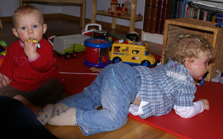 Antons framsteg fortsätter, från magliggande kan han nu resa sig halvvägs mot krypställnig. | I fredags hade Anton och jag en lugn morgon med lite sjukgymnastik på mattan här hemma, det var då som han visade första tecken på att vilja lyfta på rumpan när han låg på mage. Det var så kul att se att vi höll på att missa tiden för att byta däck på bilen. När vi väl bytt däck och Anton fått titta på alla bilar och lastbilar (2x) på däckfirman, så åkte vi hem och åt lunch. Vi har dragit ner lite ytterligare på sondmaten och Anton har därför fått mer aptit för "vanlig" mat. Efter lunch & middagslur åkte vi för att hälsa på Annas jobb. Anton var lite blyg i början men efter en stund ville han titta på alla rum, alla foto och allas datorer. När Anna slutade för dagen skulle vi gå på "Build a bear", där Anton fått presentkort av Annas kollegor. Vi försökte få Anton till att välja en nalle ... men han kunde inte bestämma sig, vi får göra ett nytt försök i nästa vecka. Istället blev det "afterwork" med Johan, Anton mumsade i sig en halv räkmacka och massor med popkorn. Det var väldigt trevligt för Anna & mig att komma ut och känna oss som "vanligt folk" I dag har Anto och jag varit uppe på avd 62 för att få hjälp med att sätta om sonden. Där träffade vi Antons läkare och vi pratade en hel del om sövningen & MRI nu på tisdag MEN framför allt pratade vi om mer minskning av sonden och om sövningen går bra kanske vi får ta bort den helt - JIPPI! Tänk om vi kunde klara oss utan den :) Oj, vilken frihet. Nu är klockan snart halv sex och hela familjen Hökfelt kommer på besök vilken minut som helst. Jag tror att det blir Pizza från Italia, mums. Ps. Jag ska se om jag kan ta ett foto på Anton i "halv krypställning", när han ska impa på Hedvig. Ds. Tja, fotot blev inte så bra (stellans knä nere till vänster och det verkade inte som om Hedvig blev jätte impad! |