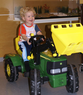 Anton äter oliver och är glad som en speleman. | Vi var på BUS lite innan kl 7 i morse för att förbereda Anton (& oss) för dagens MR av hjärnan. Efter diverse prover och annat, så sövdes Anton kl 08.55. Sedan var det en nervös väntan ... Klockan 11.30 vaknade Anton på uppvaket och var precis som vanligt, lite dåsig de första 15-20 minuterna men Anton i sinnet. Efter lite vila, så slank det ner en piggelin och en halv bägare glass. Sedan när jag åt lunch, klippte han en tredjedel av min lunch ... Skönt att han klarade sövningen utan komplikationer. När lunchen var avklarad, vara det bara Antons favorit sysselsättning som gällde: Den gröna traktorn på avd 62. Det går inte att missa hur kul han tycker det är, se bilden. Lite efter kl 13 blev Anton utskriven (vi som var bereda på att få stanna över natten!!!) Hemma blev det fest med saft och kanelbulle. När Anna kom hem från jobb blev det ännu mer fest - Pasta från Italia och ett glas vin för oss. Nu ska det busas! |