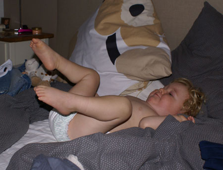 Vi har precis avslutat kvällens gympapass. Anton har visat sig på styva lina och lyft båda ben på en gång. | Idag var det planerat fotografering på dagis kl 09 men dagis ringde och meddelade att fotografen var sjuk, så det var inställt/uppskjutet. Vi var dock välkomna på besök även utan fotografering. Det passade oss ganska bra att inte behöva stressa iväg, eftesom Anton visade upp sitt sämsta morgonhumör när jag drog upp hoonom ur sängen kl 0750. Vi kom iväg och kom till dagis vid halv elva. Alla barnen var ute och lekte. Tyvärr hade jag inte någon overall på Anton, så det blev ingen sandlåda för honom men väl lite trehjuling med mig som motor. När det var dags för lunch gick vi in och Anton åt med STOR aptit. I eftermiddag har vi tagit det lugnt och sparat oss för kvällsgympan. Anton visade stora framsteg i att lyfta båda sina ben samtidigt. Faktiskt högre än vad jag lyckades fånga på bild. |